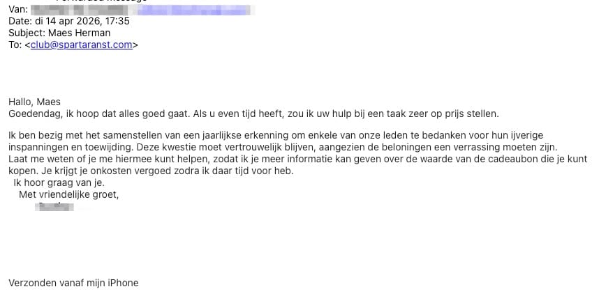 Ik ben bestuurder van een sportclub en op onze website van de sportclub staat dan ook het hele bestuur. Onderstaande email kwam zogezegd van mijn voorzitter en werd naar het algemene emailadres van de sportclub verstuurd.